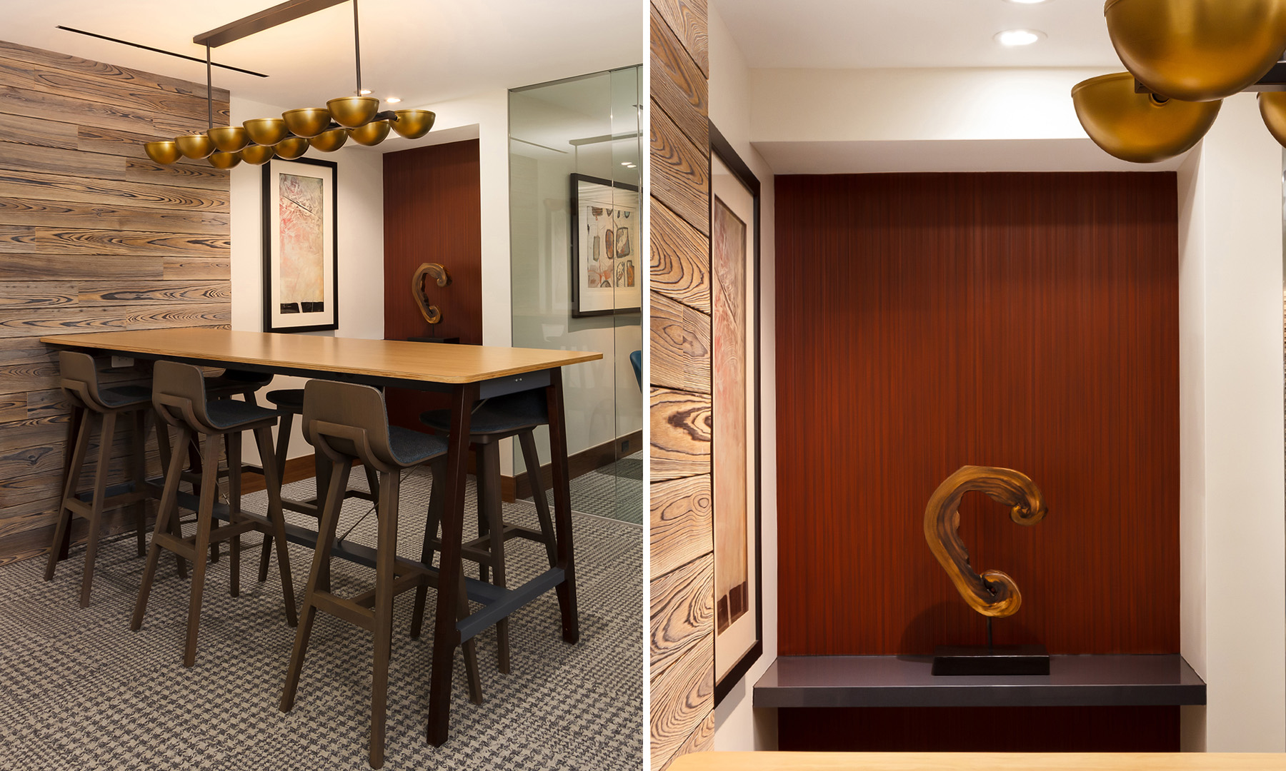 We used wood materials reminiscent of the “oak theme”, reinforcing the name of the street on which this property is built. Organic materials, earth tones, and textures were juxtaposed with rich jewel tones to create a casual yet elegant ambiance. Features such as branch hardware on the entry doors, live edge countertops, and wood bark veneer were integrated throughout the interiors to reinforce the property branding.