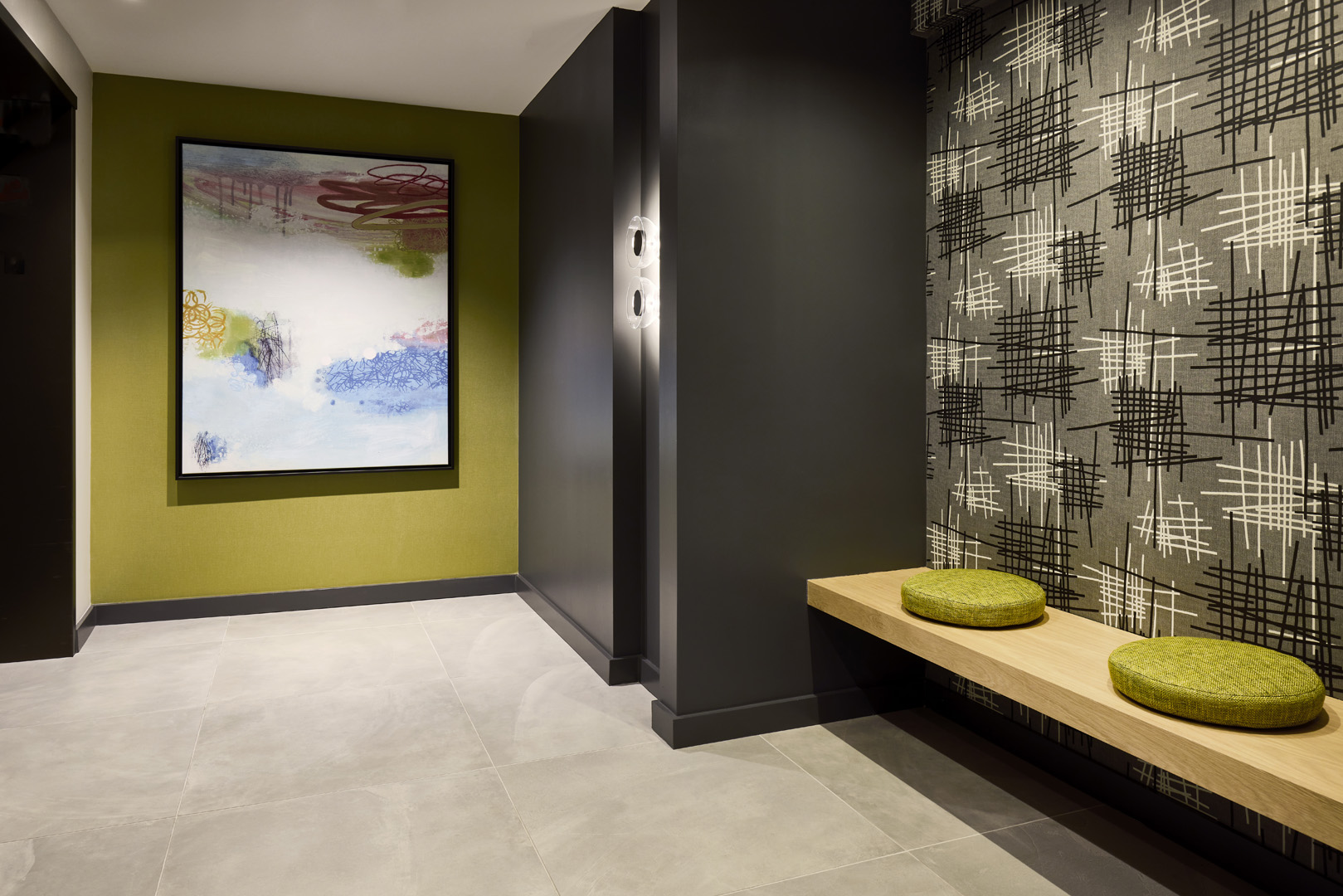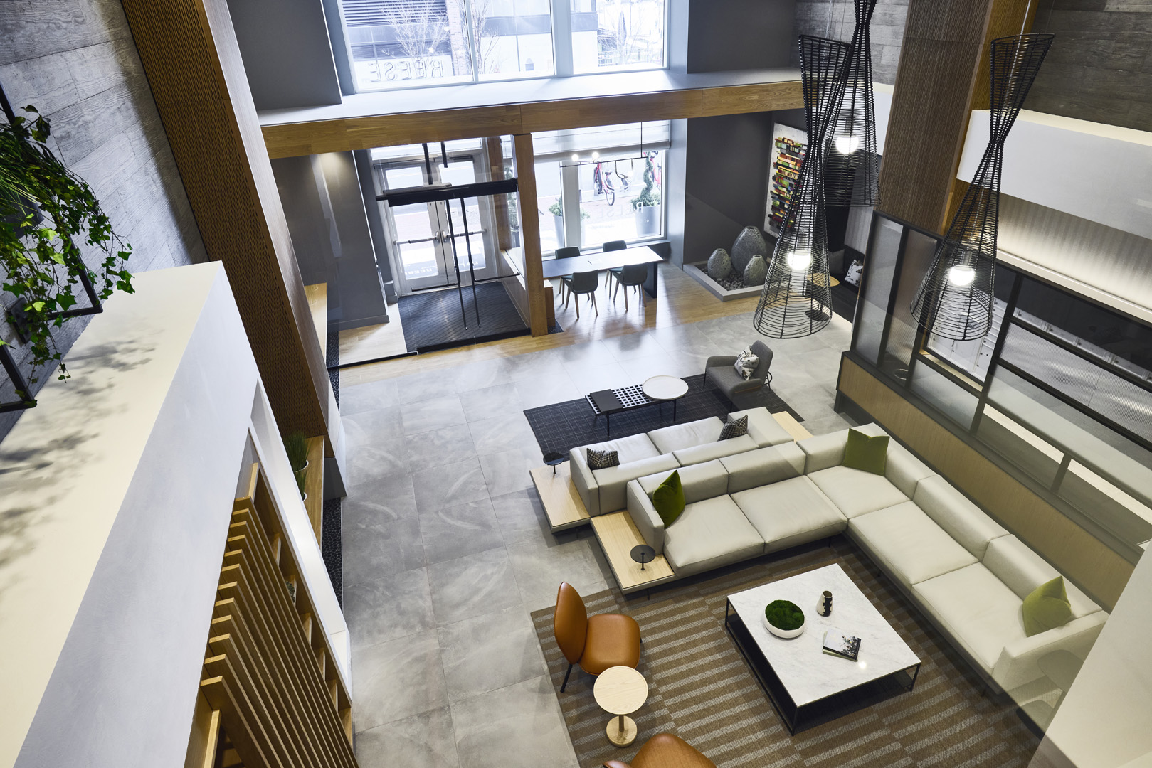 Intended for the technological residents at the peak of their careers who appreciate the benefits of living in a multi-family building, this project called for visually appealing amenity space interior design of such spaces as sound-insolated podcast rooms and a conference room in the lobby mezzanine, a café with work booths and a “Ted Talk Studio” for presentations, group learning opportunities and communal on-screen entertainment events.