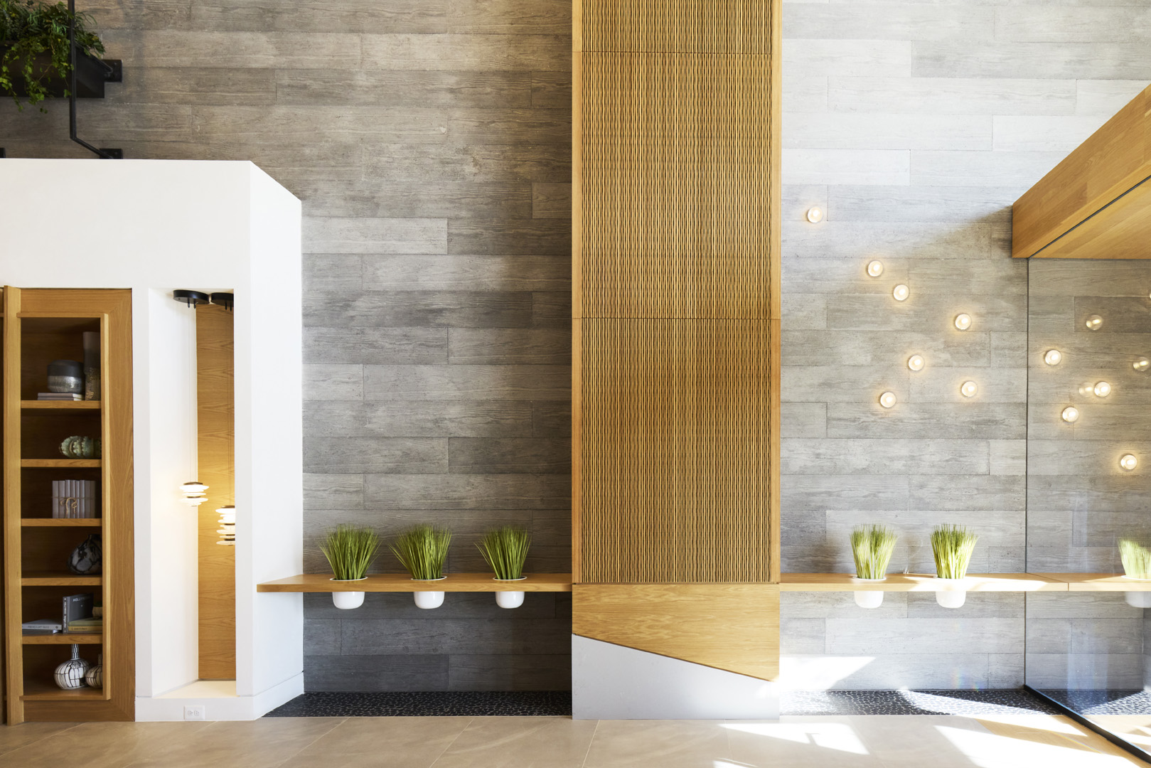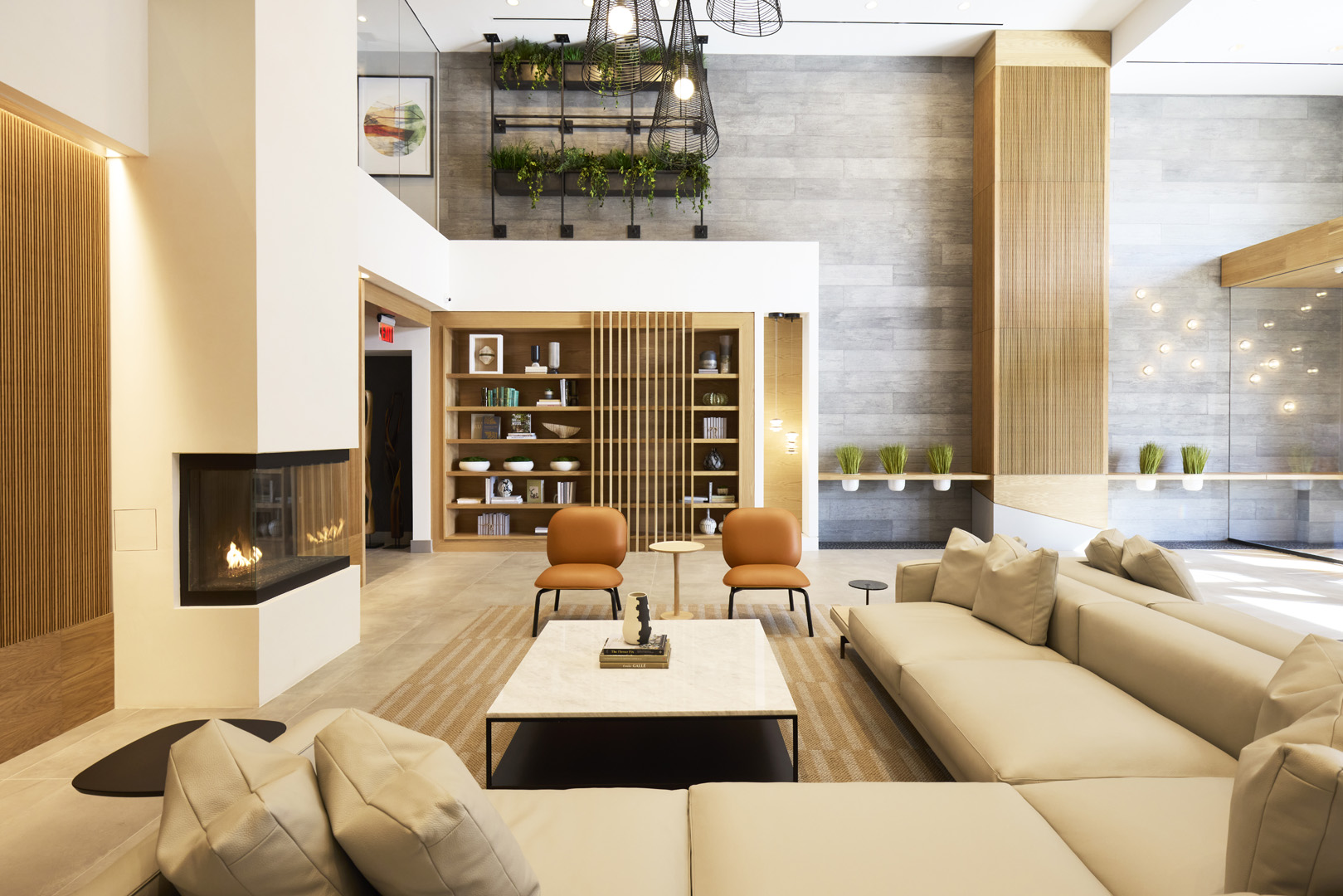The interior design in this multi-family structure works with the architectural design so spaces are filled with light, greenery, and authentic, sustainable finishes. A bubbling water feature and fireplace greet residents, making a connection to nature that flows through the common spaces.