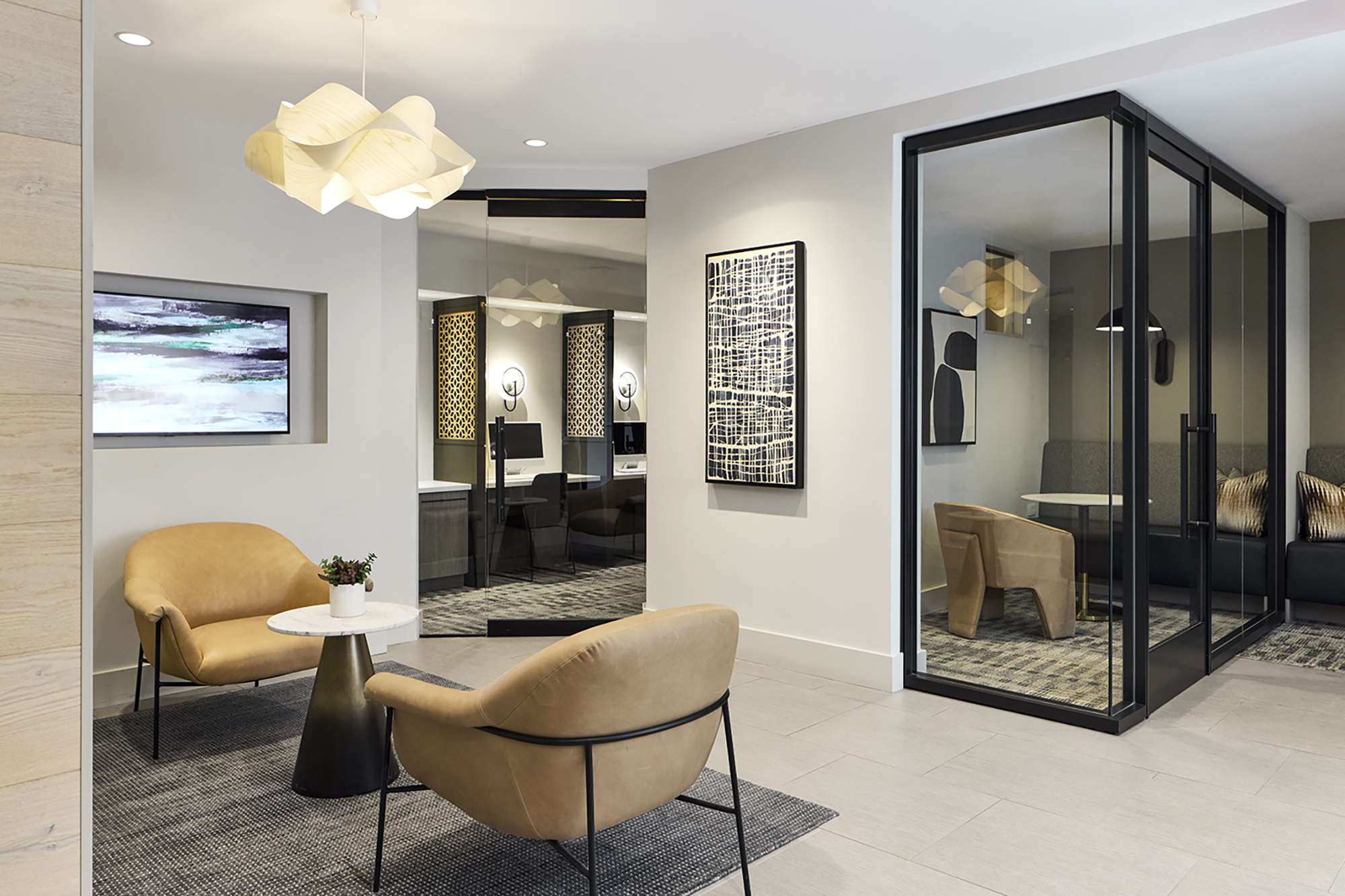 An underutilized conference room was converted into a convenient self-serve package center, while the business lounge and coworking areas were expanded to include private work pods tailored to today’s remote workforce. The clubroom,fitness center, and corridors were refreshed with a serene palette of natural white oak, calming blues, and soft whites, creating a sense of wellness and tranquility. Each decision was carefully balanced to deliver an upscale,market-rate feel while remaining mindful of durability standards and budget.
