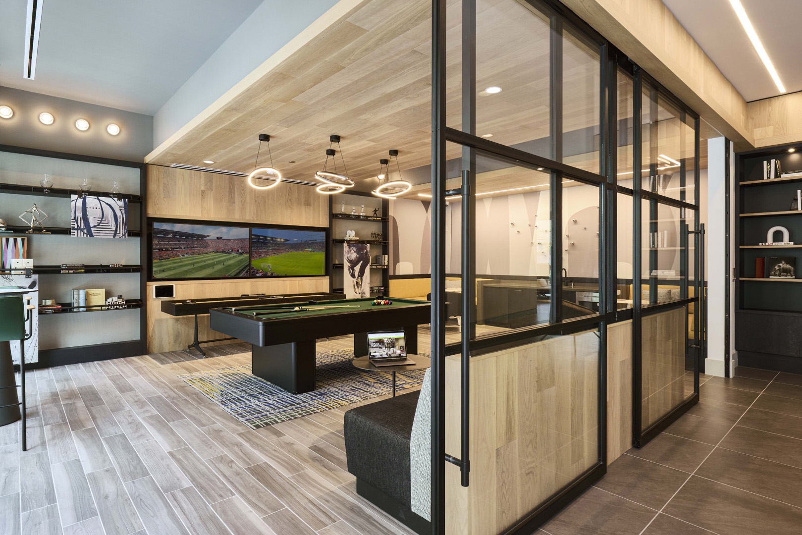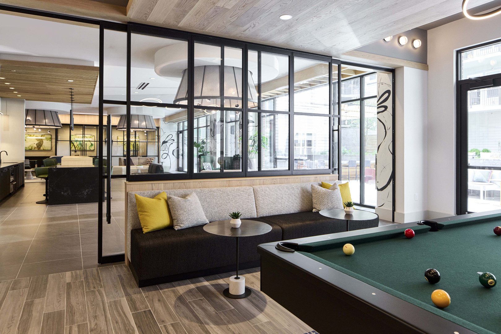 Woven into the visually connected indoor and outdoor amenities are multiple areas to remote work, play, socialize, or find a cozy place to relax alone while enjoying community activity. With clustered social spaces for grilling, sunbathing, work, and play, the courtyard is an intimate urban garden that can be viewed from the amenities as well as resident apartment homes.