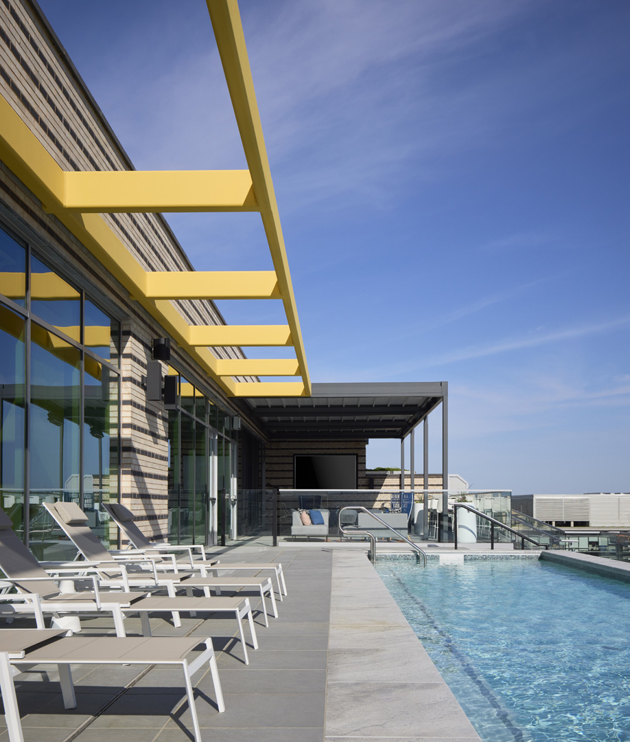 Examples of this kaleidoscope of colors and textures are everywhere in the multifamily building, including its entryway – yellow and glass, and steel which reflects the connection between the exterior architecture and interior design. The street morphed into the SoNYa with its dark lobby floor resembling the pavement outside. The rectangular lobby lighting fixtures were chosen as they mirror the exterior window mullions encasing the structure’s windows in both shape and color. Even more exciting, when the light reflects just so, the fixtures produce a grid-like pattern on the ceiling emulating a map grid.
